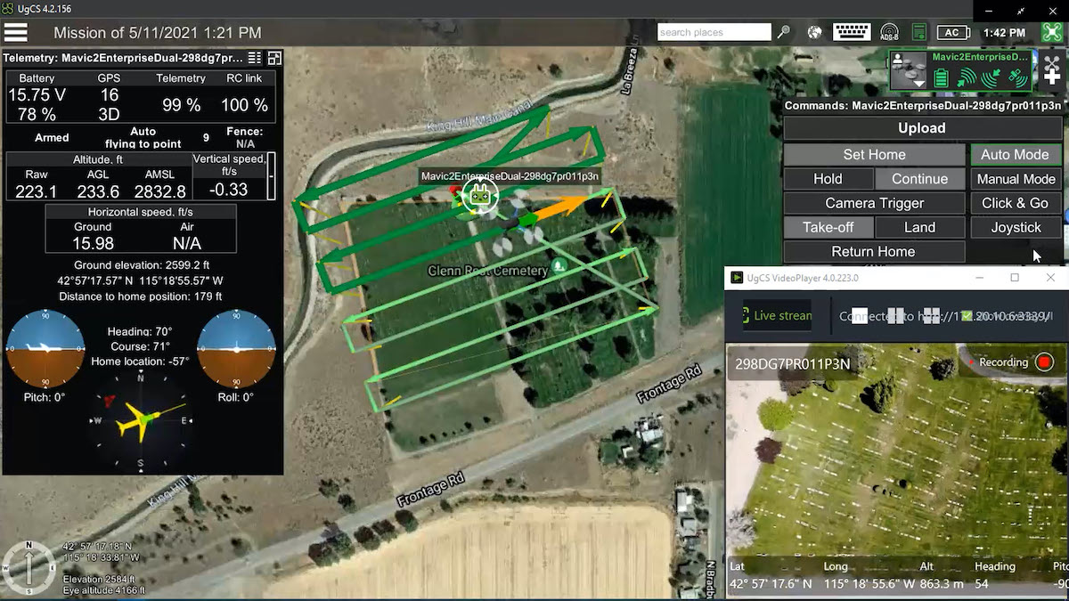 The project starts with students flying a UAS over cemeteries located near to where they live. First, they must prepare the mission in a simulator based on UgCS mission planning software from SPH Engineering. Students then practice the flight using the hardware-in-the-loop (HIL) simulation technique, which imitates the planned path and provides an understanding of different flight parameters. When ready to perform the actual flight, the faculty prepares the set-up in the field and enables students to connect remotely to the ground station and control the Mavic 2 Enterprise Dual drone using a Beyond Visual Line of Sight (BVLOS) waiver from the Federal Aviation Administration (FAA).