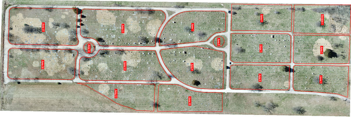 With the use of Pix4Dmapper, the students process the obtained aerial images of the cemeteries into orthomosaics and import to DroneGIC (prev.ATLAS), where they master the AI detectors. Additionally, the faculty provides two other sets of cemetery orthomosaics with different appearing grass and vegetation surrounding the headstones (e.g., from brown in winter to green in spring). While some headstones are located under bare branches in winter, in spring they are covered by trees full of leaves. Students can then use their own and two provided orthomosaics to build and train the AI detectors to count differently shaped and sized headstones.