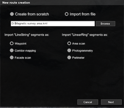 - ‘Import from file’ – select this to import a KML file or route file in UgCS format