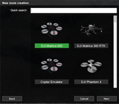 Once the boundaries are defined, select the drone that you will use for your magnetic survey and press ‘Next’: