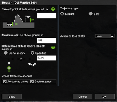 Firstly, make sure that the emergency return altitude is set high enough in the route parameters window. This altitude should be high enough to allow a safe way back from any point of the route, taking into account all obstacles and terrain features.