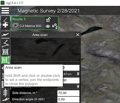The next step in the manual route creation process is to click the ‘Area scan’ icon on the left side of the UgCS window.