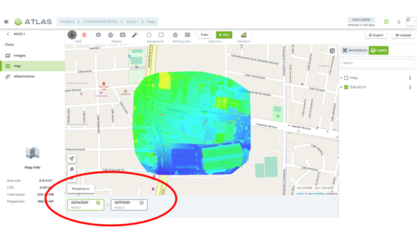 The flight mission was planned and executed at a height of 60m to collect the necessary images to produce an orthomosaic and its corresponding digital elevation model, as there are preliminary excavations and fillings in the project. These products were uploaded to ATLAS.