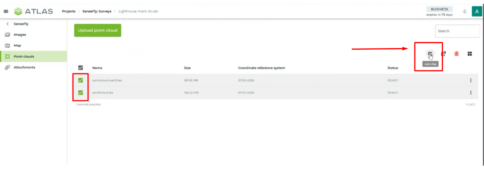 - Go to “Point clouds” tab of the survey to upload point cloud files.