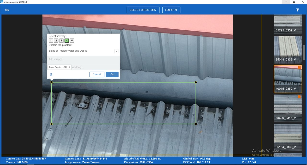 Then, collected images have been annotated in the ImageInspector software by SPH Engineering and a resulting MS Word (DOCX) report has been generated. The report contains only pictures of found issues, severity levels, and text comments for better understanding and decision-making.