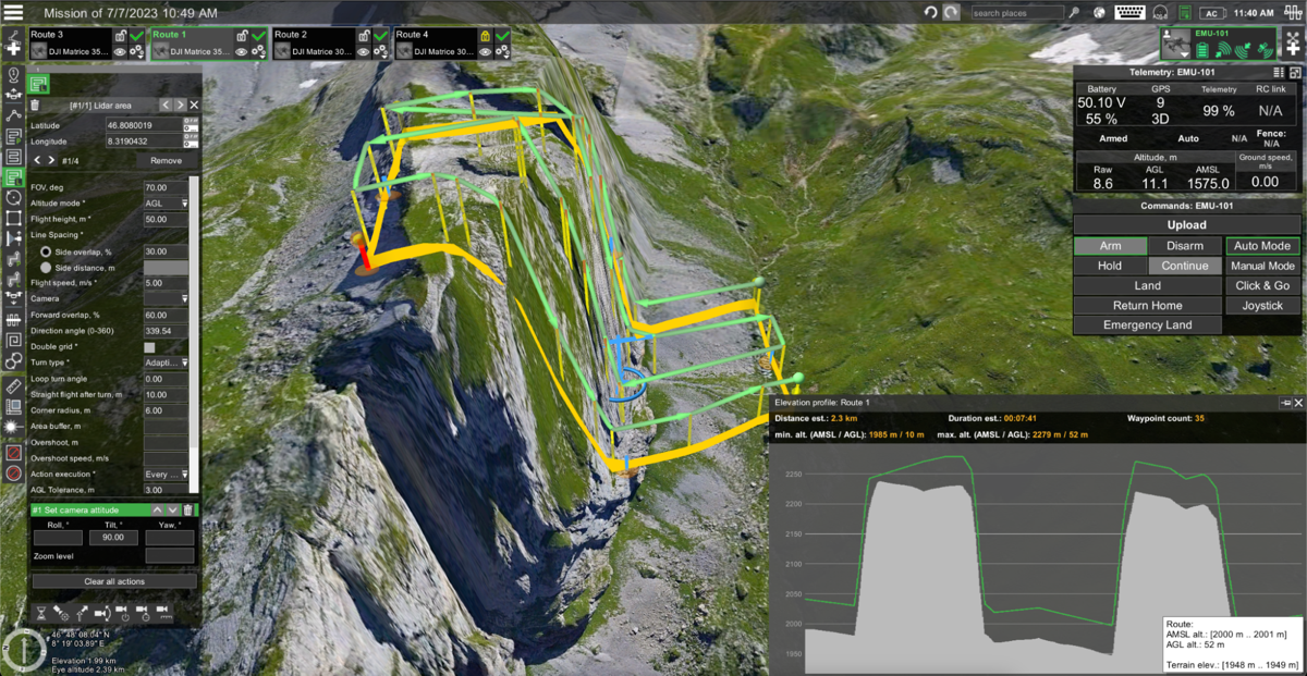 Smart AGL functionality alters the handling of side movements in area scan missions and overshoot segments.. Now side movements also incorporate Smart AGL terrain following when moving uphill. This helps to prevent dangerous situations when the drone might get too close to the terrain when the distance between survey lines is longer. When moving down the hill, side movements will keep the flight level to optimize battery usage.