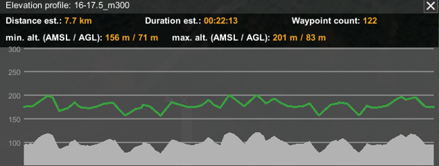 In order to keep the LiDAR data quality consistent throughout the flight, the drone carrying the sensor must maintain a constant altitude to the ground surface. One of the features of UgCS is the ability to plan flights according to terrain elevation data. By default UgCS is using SRTM4 terrain elevation data but custom data can be used as well. The user can also preview the flight in 3D and compare the planned flight trajectory to the terrain elevation profile.